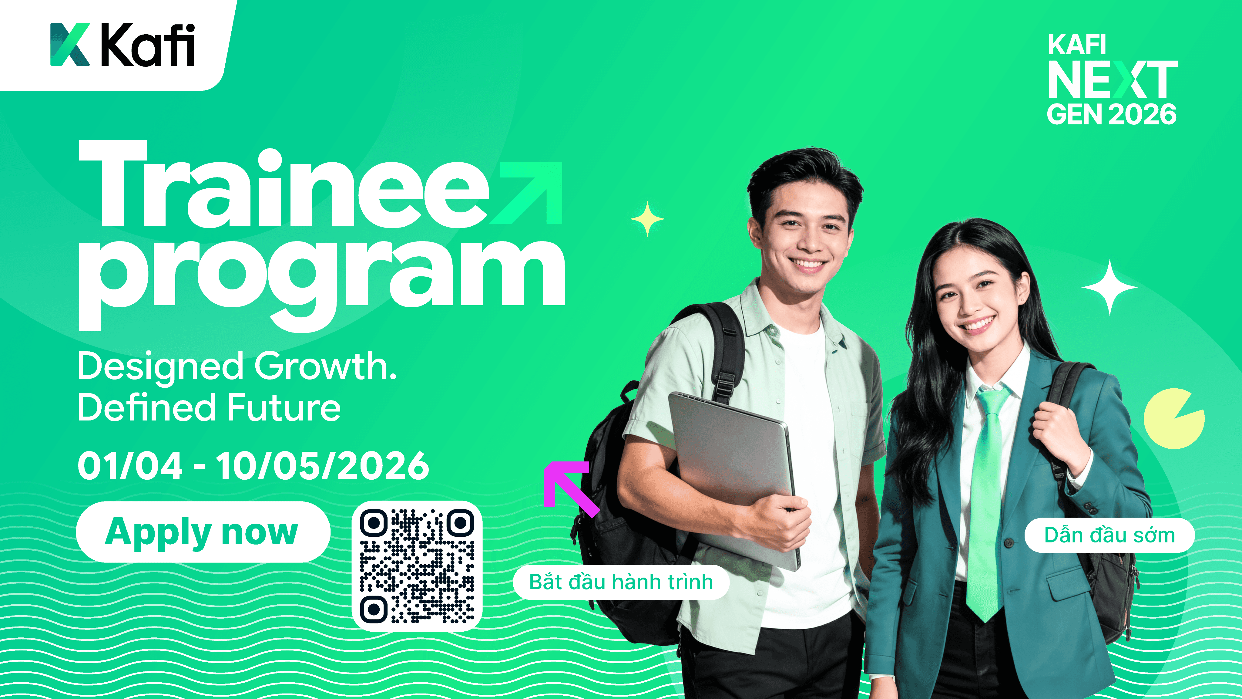 Tại Kafi, chúng tôi tin rằng sự phát triển của doanh nghiệp bắt đầu từ sự phát triển của con người. Đó cũng là lý do KAFI NEXT GEN 2026 được xây dựng như một chương trình phát triển nguồn nhân lực kế cận, dành cho những ứng viên trẻ sẵn sàng học hỏi, thử thách và bứt phá.